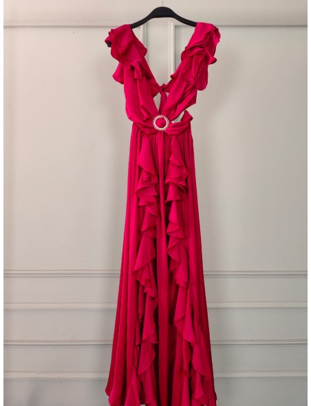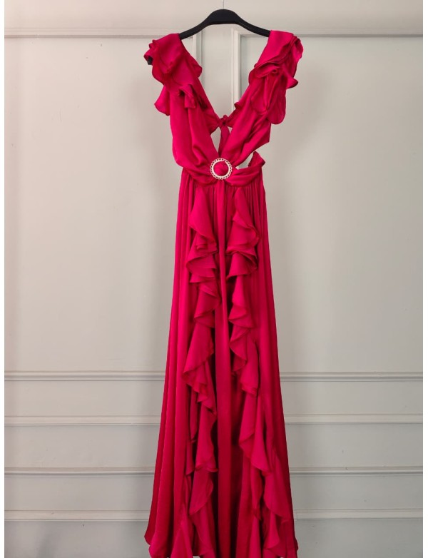 SLEEVELESS RUFFLE DETAIL CUT-OUT WAISTED MAXI DRESS