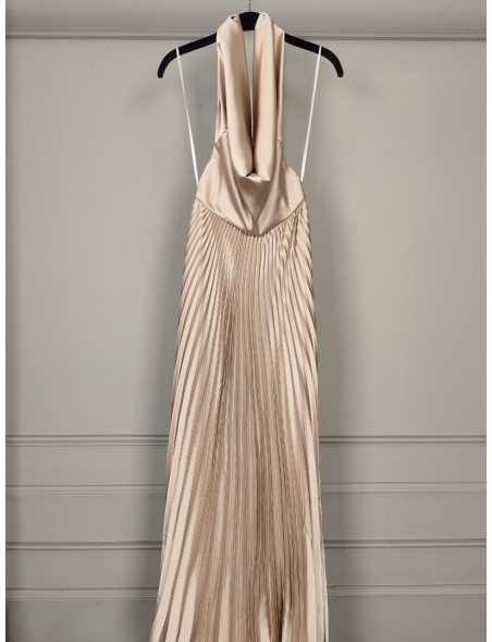 COWL NECK CB ZIPPER PLEATED MAXI DRESS