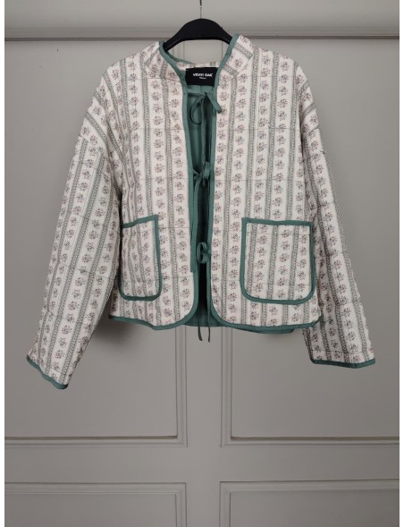 WALL PAPER PRINT QUILTED JACKET WITH CONTRAST BINDING AND FRONT TIE