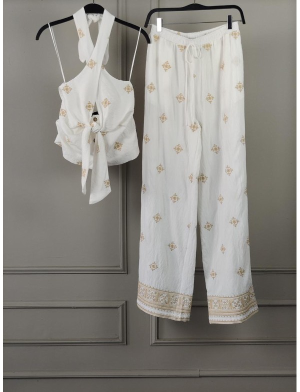 HALTER TIR FRONT CHEST TOP & ELASTIC WAISTED LONG PANTS SET